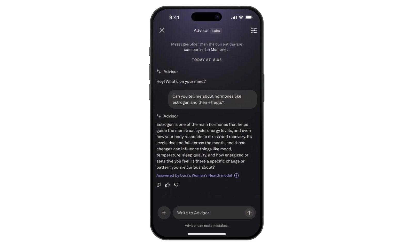 O modelo é projetado para mulheres. Quando as mulheres fazem perguntas relacionadas à saúde, baseia-se em pesquisas selecionadas sobre saúde da mulher provenientes de fontes verificadas e confiáveis. Combinando-o com os dados do usuário coletados do anel Oura, ele avalia dados biométricos relevantes e padrões de longo prazo de sono, atividade, ciclo menstrual, métricas de gravidez e outros dados para fornecer insights precisos e confiáveis.