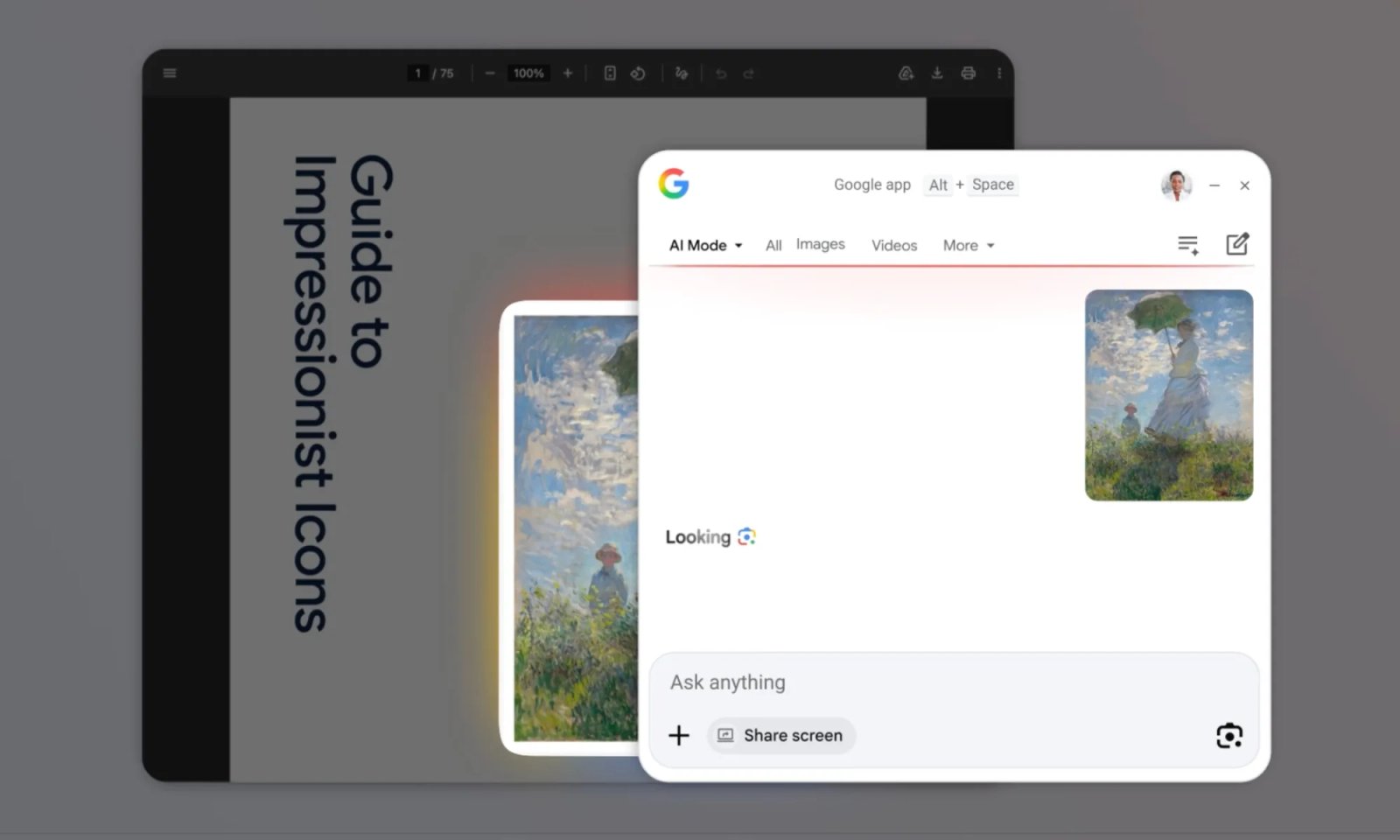 Bastante, na verdade. O Google Lens, a ferramenta de pesquisa nativa baseada em imagens da empresa, está integrado diretamente no novo aplicativo do Google para Windows. Ele permite que os usuários cliquem e pesquisem qualquer coisa que esteja visível na tela.