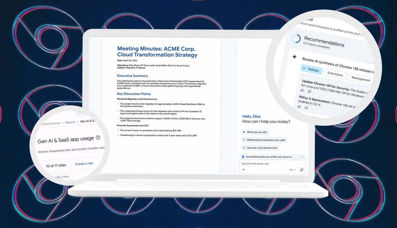O Google anunciou novos recursos do Chrome especificamente para empresas. A atualização traz recursos de IA aos trabalhadores, ao mesmo tempo que dá às equipes de TI maior controle sobre quais ferramentas de IA são usadas no local de trabalho. O Chrome Enterprise agora é um lugar onde o trabalho é realizado, a IA opera inline e os administradores podem reforçar a segurança, tudo dentro do navegador.