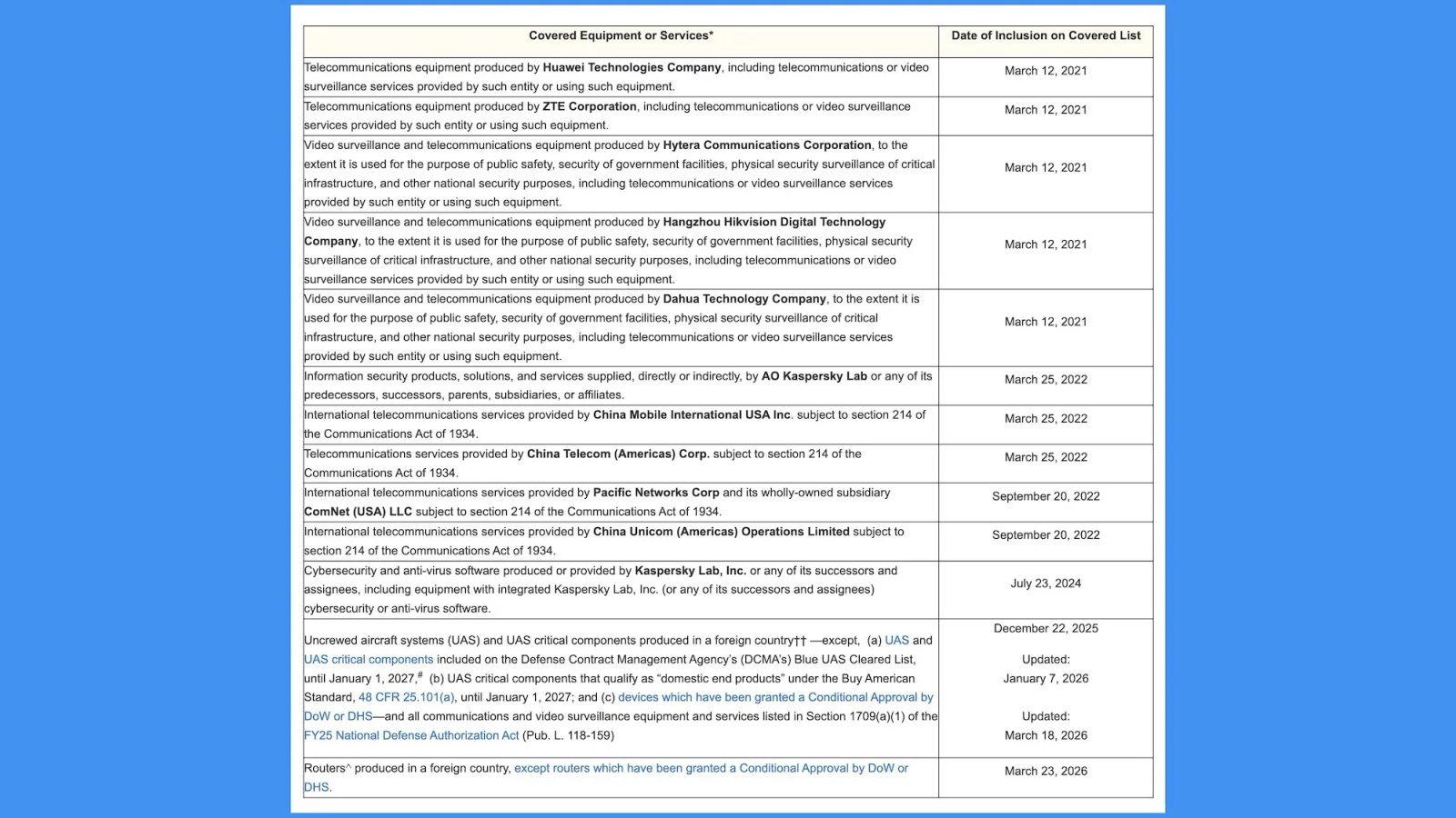 A FCC adicionou oficialmente roteadores de fabricação estrangeira à sua Lista Coberta, uma lista de equipamentos considerados uma ameaça à segurança nacional dos Estados Unidos. Isso significa que nenhum novo roteador produzido no exterior pode ser vendido nos Estados Unidos, a menos que receba uma isenção especial.
