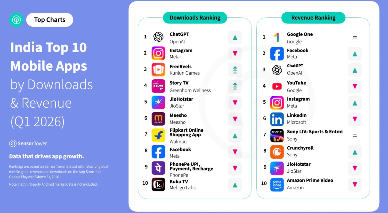 Grande parte dos gastos da Índia no primeiro trimestre foi capturada por plataformas globais, com Google One, Facebook, ChatGPT e YouTube entre os maiores ganhadores. Os players nacionais foram mais proeminentes no streaming de vídeo, com JioHotstar e SonyLIV com classificação elevada. Um padrão semelhante surgiu em downloads, onde ChatGPT, Instagram e o aplicativo chinês de curtas-metragens FreeReels lideraram o mercado, seguidos por aplicativos indianos, incluindo Story TV, JioHotstar e Meesho.