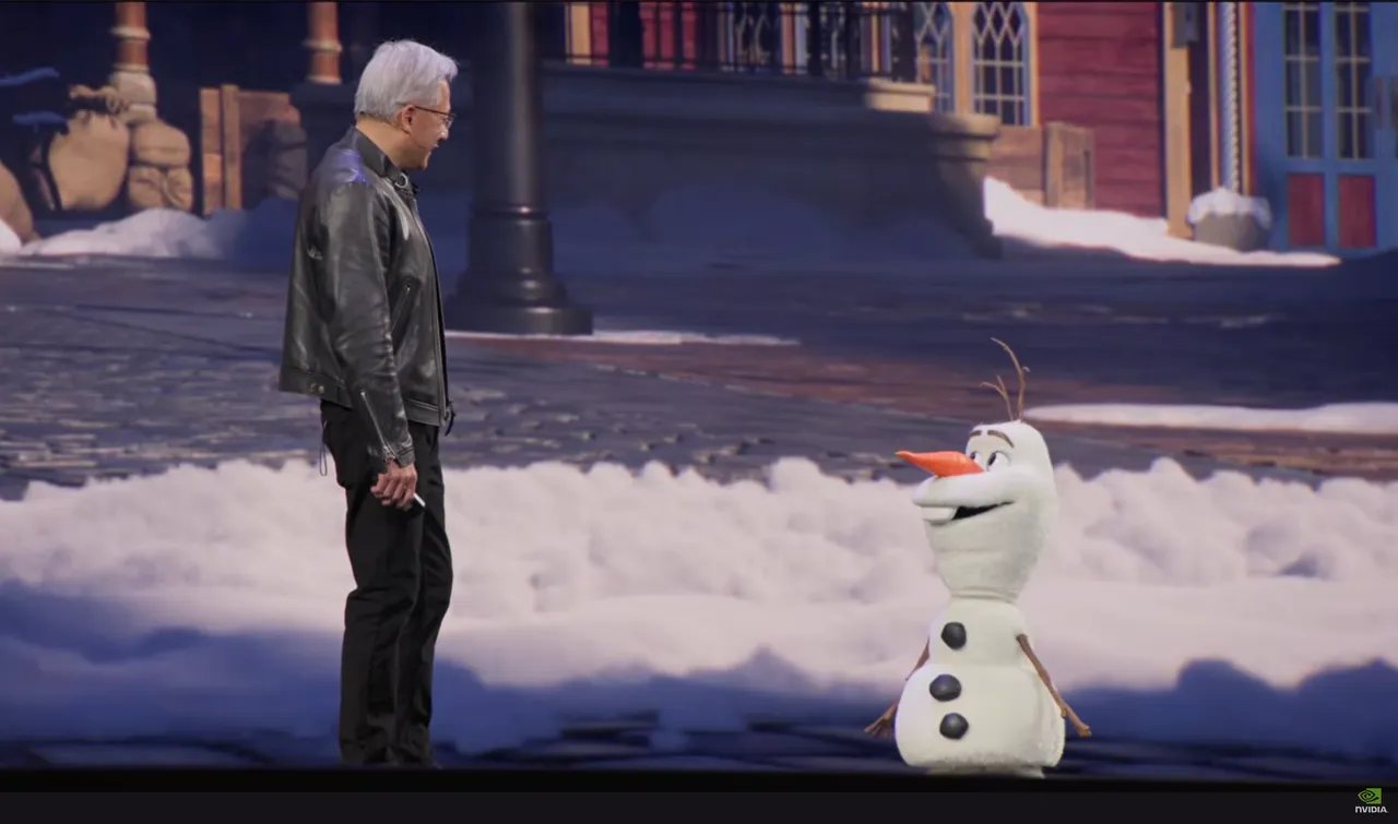 Para encerrar sua palestra Nvidia GTC na segunda-feira, o CEO Jensen Huang trouxe um convidado inesperado: uma versão robô ambulante e falante de Olaf, o boneco de neve animado do filme Frozen da Disney. Huang explicou ao robo-Olaf que ele roda na plataforma Jetson da Nvidia e aprendeu a andar dentro do simulador Omniverse da empresa