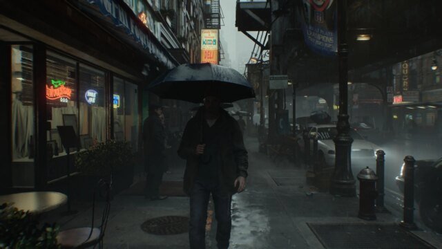 O primeiro título a promover as novas capacidades PSSR é Réquiem de Resident Evil. Embora a versão normal do PS5 não suporte ray tracing, a versão PS5 Pro oferece. Na sombria sequência de abertura do jogo, onde a protagonista Grace Ashcroft caminha pelas ruas molhadas pela chuva, você pode ver os faróis dançando na calçada molhada e os guarda-chuvas encharcados dos pedestres. Com a configuração de traçado de raio do jogo desativada, você perde muitas das sombras e reflexos que ajudam a definir o clima do jogo.