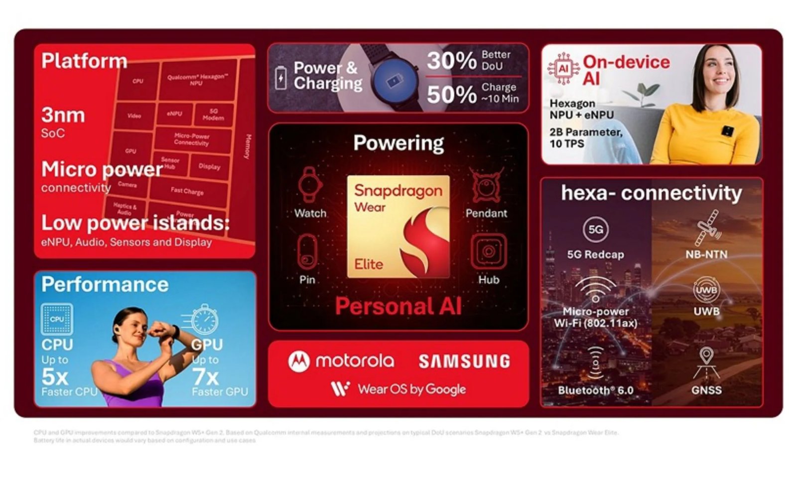O Snapdragon Wear Elite é construído em um processo de 3 nm e adota uma arquitetura de CPU big.LITTLE, combinando um núcleo de alto desempenho com freqüência de 2,1 GHz com quatro núcleos de eficiência com freqüência de 1,95 GHz. Qualcomm diz esta configuração oferece um salto de 5x no desempenho de núcleo único em comparação com o Snapdragon W5 + Gen 2. Uma GPU Adreno atualizada também faz parte do pacote, oferecendo desempenho gráfico até 7x maior.