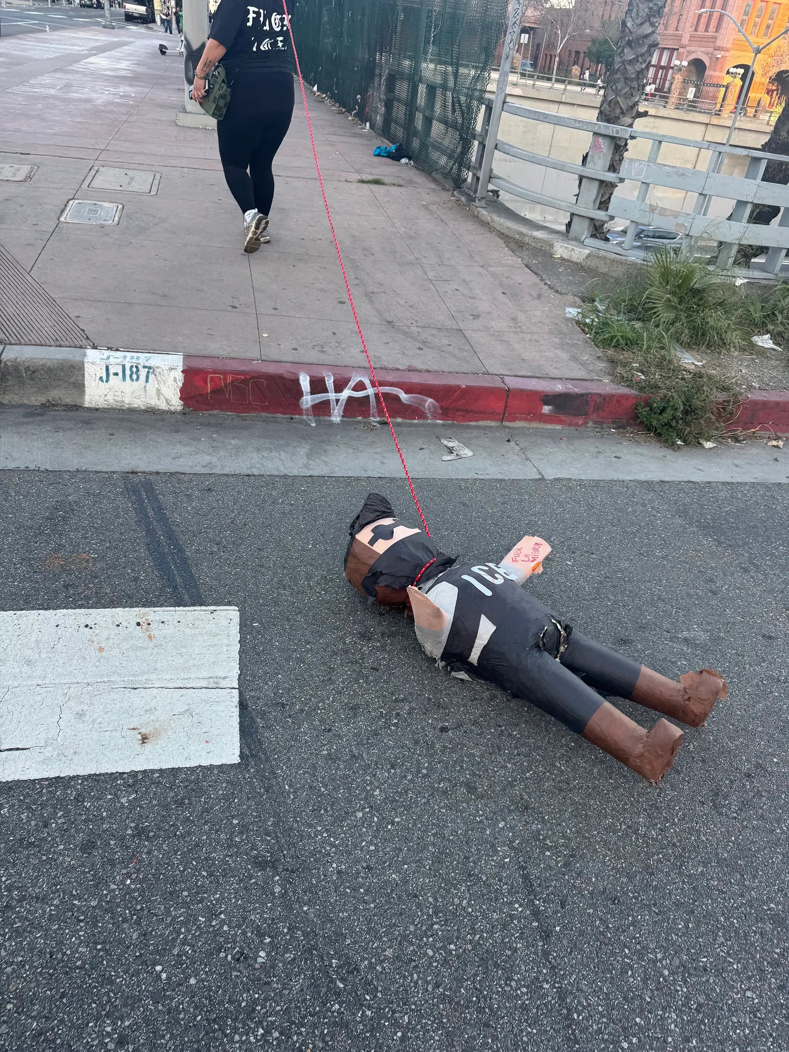 Última foto tirada: Uma garota em um protesto anti-ICE arrastando uma piñata de agente do ICE