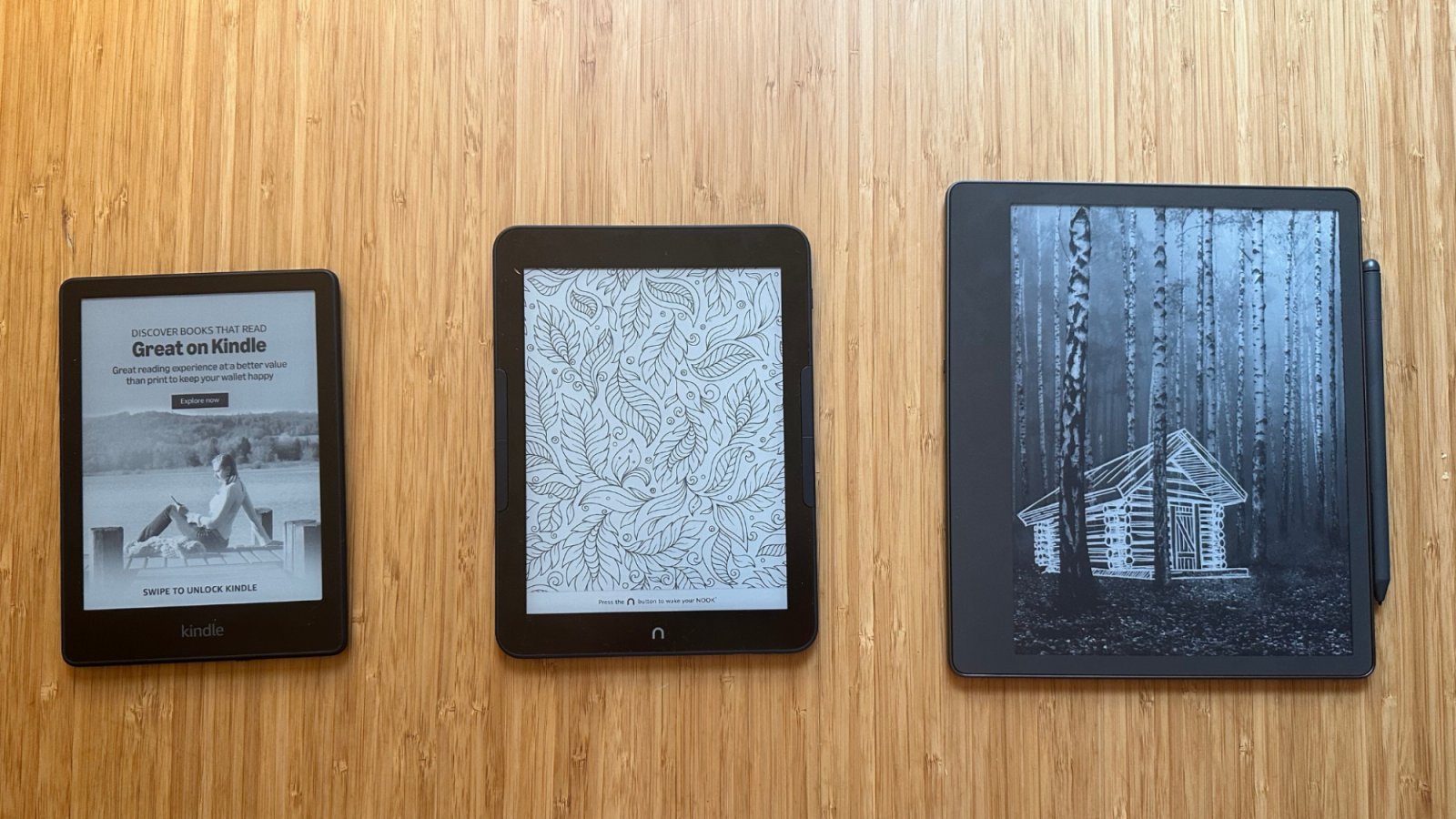 Da esquerda para a direita: Kindle Paperwhite, Nook GlowLight 4 Plus, Kindle Scribe