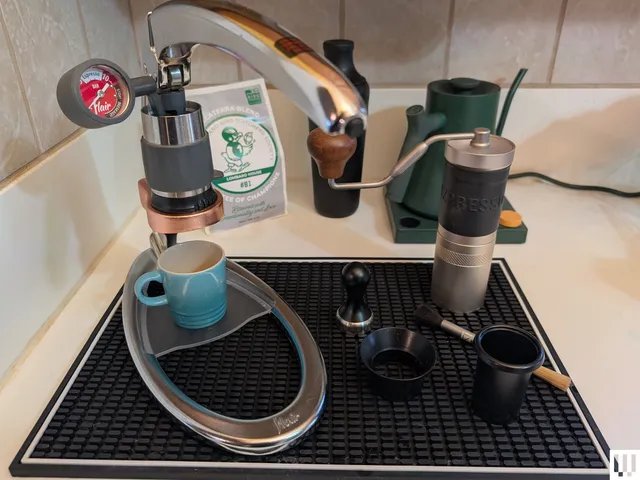 Existem outras peças cruciais neste quebra-cabeça, e eu me comprometi totalmente com isso, optando por uma chaleira simples de pescoço de ganso e um moedor de rebarbas manual, escolhidos por sua simplicidade e consistência. Os entusiastas do café devem reconhecer instantaneamente o Chaleira Stagg EKG da Fellowe sim, o meu é coberto de verde e amarelo, lembrando meu time de futebol favorito, obrigado por notar. O 1ZPresso JX-Pro S não é particularmente sofisticado, mas é fácil de limpar e consistente, e foi altamente recomendado pelo Reddit, embora eu admita que fiquei tentado pelo Comandante C40uma esmerilhadeira manual que custa mais do que o resto da minha configuração combinada.