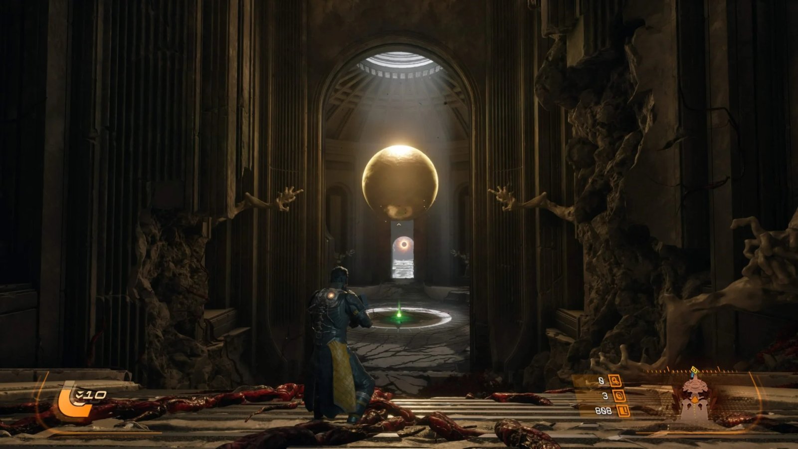 Se você jogou Retorno antes, você conhecerá muitos dos truques Saros tem na manga. Os inimigos mais uma vez disparam projéteis codificados por cores que podem ser disparados ou evitados com segurança, alguns inimigos são protegidos e há encontros ocasionais em que uma parede invisível prende você no campo de batalha com várias ondas de inimigos para destruir. Além do traço, a mobilidade se expande com um gancho e zonas opcionais que oferecem a chance de obter melhores itens, representados por armas, captadores de saúde ou artefatos com benefícios e efeitos colaterais negativos para tornar as corridas mais fáceis ou mais difíceis.