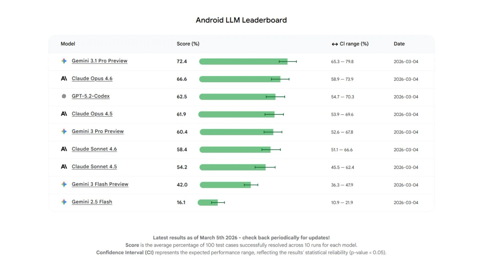 Com a primeira versão do Android Bench, o Google planejou “medir puramente o desempenho do modelo e não focar no uso de agentes ou ferramentas”. Os resultados destacam uma grande lacuna, com os modelos completando com sucesso entre 16% e 72% das tarefas de benchmark. A empresa diz que a publicação desses resultados deve facilitar aos desenvolvedores a comparação de modelos e a escolha daqueles que são realmente capazes de lidar com problemas reais de codificação do Android.