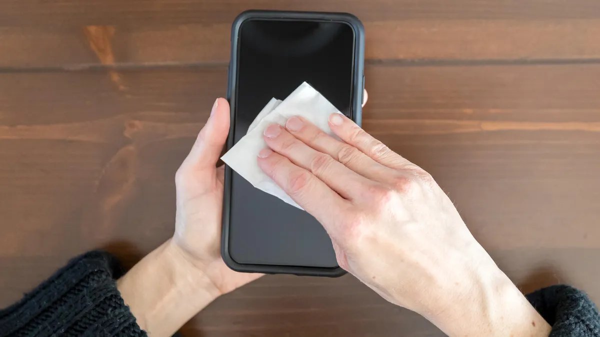 Apple agora aprova o uso de Clorox Wipes e desinfetantes semelhantes, que não eram recomendados antes da pandemia por serem considerados muito abrasivos no revestimento da tela. AT&T aconselha borrife uma solução de álcool isopropílico a 70% em um pano macio e sem fiapos e limpe o dispositivo. A Samsung também recomenda usando uma solução de álcool 70% com um pano de microfibra. Sempre certifique-se de que seu telefone esteja desligado antes de limpá-lo.