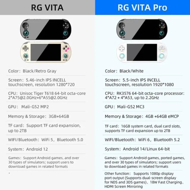 O Vita padrão é uma opção mais acessível que possui tela IPS de 5,46 polegadas com resolução de 720p, alimentada por um chipset Unisoc T618, emparelhado com 3 GB de RAM e 64 GB de armazenamento. Por outro lado, o RG Vita Pro apresenta uma tela IPS 1080p um pouco mais alta, um processador Rockchip RK3576 mais capaz, 4 GB de RAM e o mesmo suporte de armazenamento expansível via microSD.