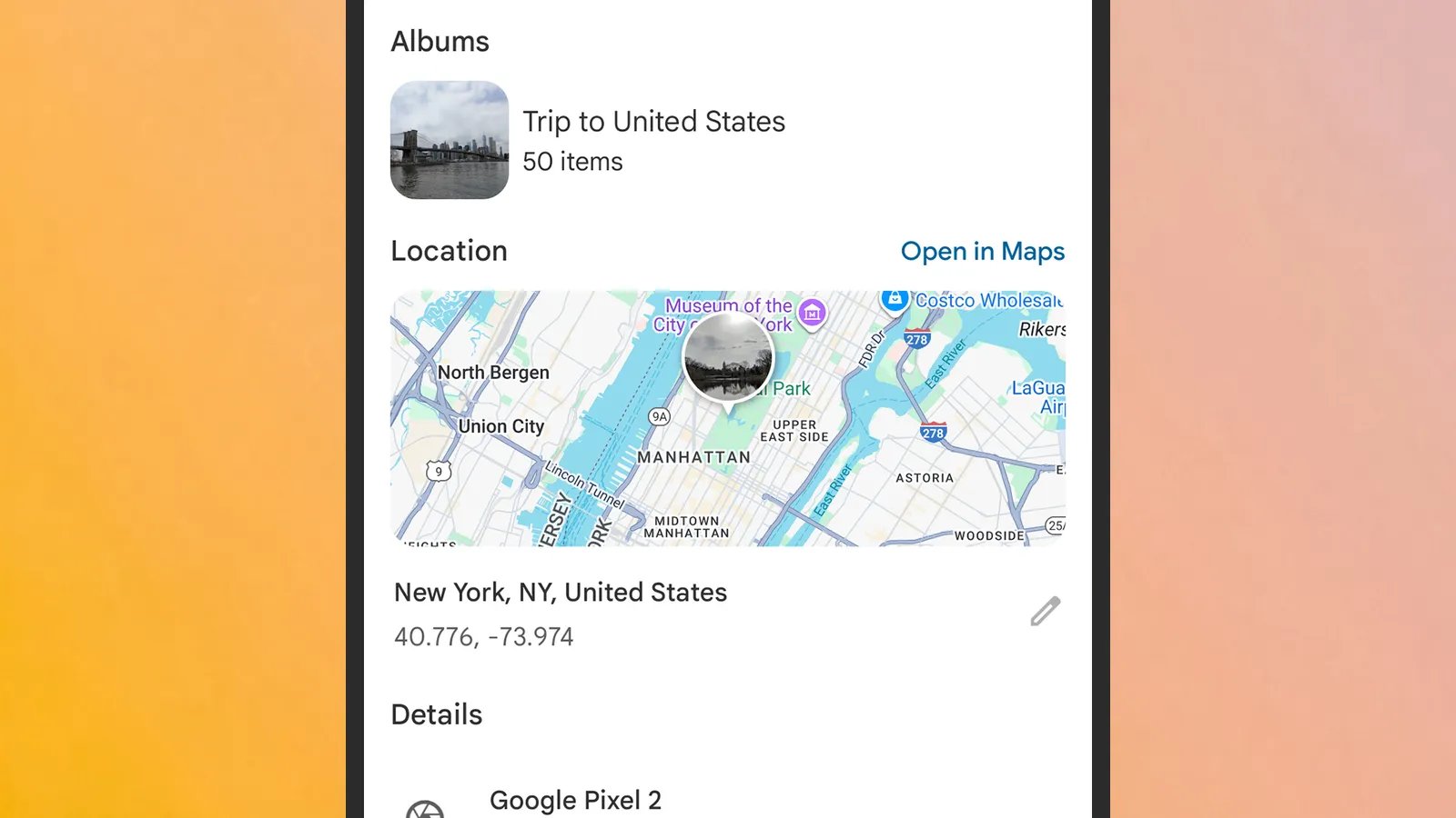 Existem várias maneiras de ver os metadados armazenados em uma foto. No Google Fotos para Android, toque em uma imagem para abri-la, depois toque nos três pontos (canto superior direito) e escolha Sobre. Se as informações de localização estiverem anexadas, você verá a foto colocada em um mapa. Com o Google Fotos na webdepois de abrir uma imagem, você poderá ver os mesmos metadados clicando no botão de informações (o pequeno “i” em um círculo) no canto superior direito.
