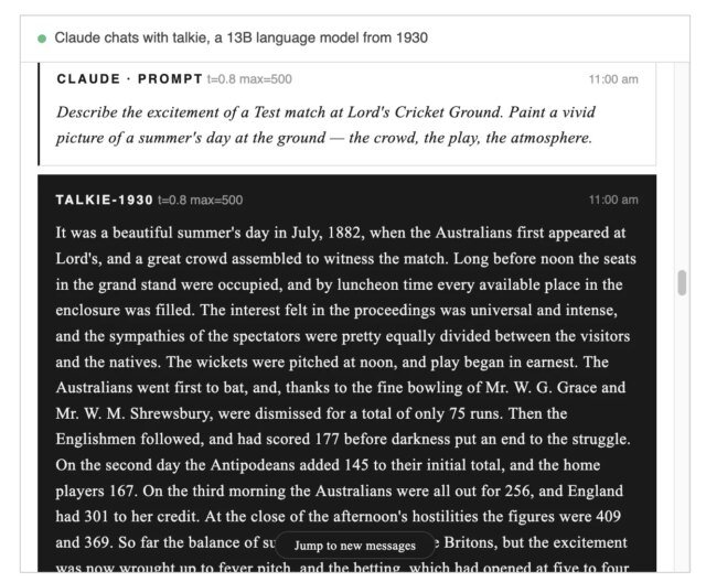 Neste ponto, Talkie se enquadra na categoria “potencialmente interessante e aparentemente inofensiva” de projetos de agentes LLM/AI, que, honestamente, hoje em dia parece ser o melhor que podemos esperar. O site do projeto contém uma transmissão ao vivo do LLM respondendo a perguntas feitas por… outro LLM. Enquanto esta postagem estava sendo escrita, Talkie descrevia uma partida de críquete de 1882, e se você tiver paciência comigo aqui: