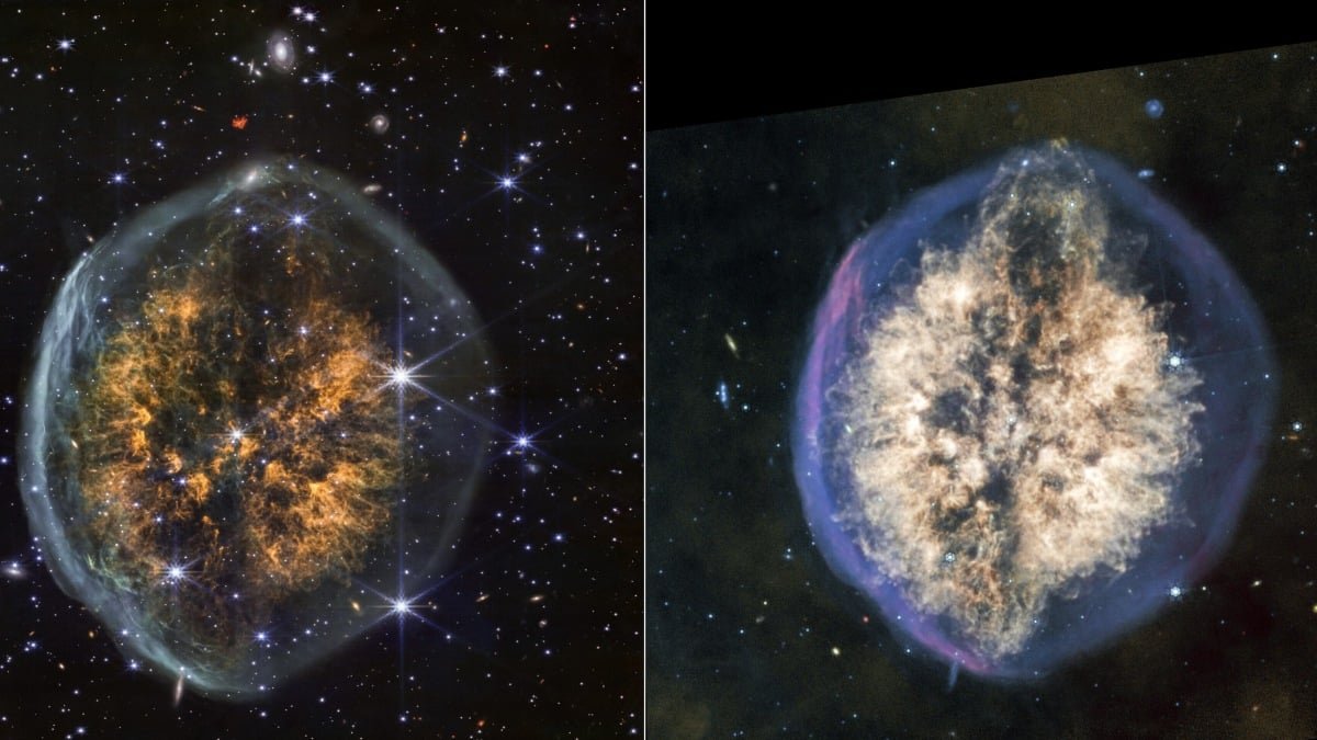 Uma leve bolha externa, composta principalmente de hidrogênio, marca um período anterior de eliminação de material. Mais perto do centro, uma nuvem mais complexa de gases mistos forma o “cérebro” dentro da casca. Os instrumentos de Webb também mostram mais poeira brilhando no infravermelho médio, enquanto a visão do infravermelho próximo permite que estrelas de fundo e até mesmo galáxias distantes brilhem.