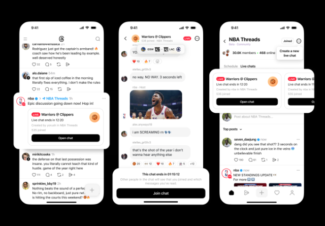 Os chats ao vivo serão lançados primeiro na comunidade NBA Threads durante os playoffs. Personalidades da mídia, incluindo Malika Andrews, Rachel Nichols e Da Kid Gowie, hospedarão chats ao vivo durante os jogos.