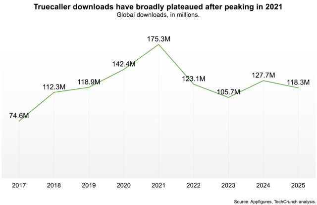 À medida que a concorrência aumenta, o crescimento da Truecaller começa a desacelerar. Dados compartilhados com o TechCrunch da Sensor Tower mostram que os downloads da Índia caíram 16% ano a ano em 2025, enquanto os downloads globais diminuíram 5%, marcando uma reversão após vários anos de crescimento. Dados separados do Appfigures mostram que os downloads atingiram um pico de 175 milhões em 2021, caíram drasticamente em 2022 e, desde então, oscilaram em torno de 120 milhões anualmente.