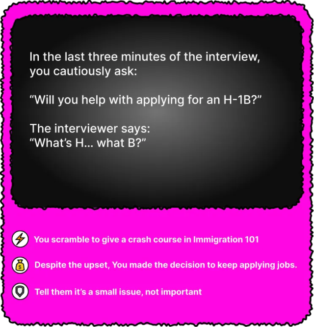 A equipe por trás do H1B.Life começou a desenvolver o jogo entrevistando imigrantes. Até agora, Yang diz que conversou com mais de duas dúzias de pessoas sobre suas viagens no H-1B e usou essas entrevistas para tornar o jogo mais realista e preciso. O maior desafio agora é descobrir como equilibrar a explicação precisa das complicadas regras de imigração e garantir que o jogo ainda seja divertido.